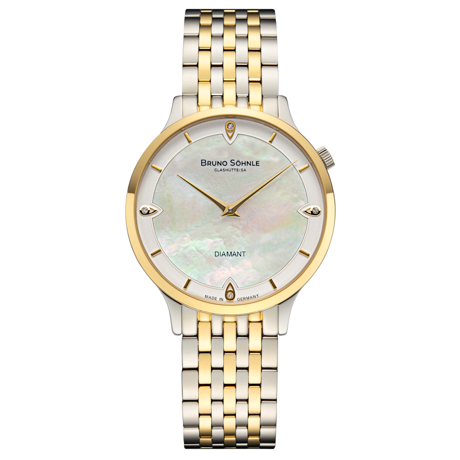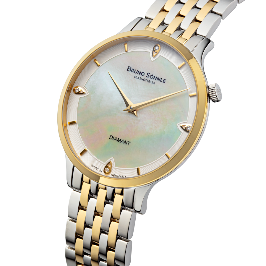 Quarzwerk in veredelter Bruno Söhnle-Ausführung (Basiswerk Ronda 1062), Durchmesser 35,0 mm, Höhe 5,5 mm, 3 bar, Saphirglas innen entspiegelt, Faltschließe, 4 Brillanten