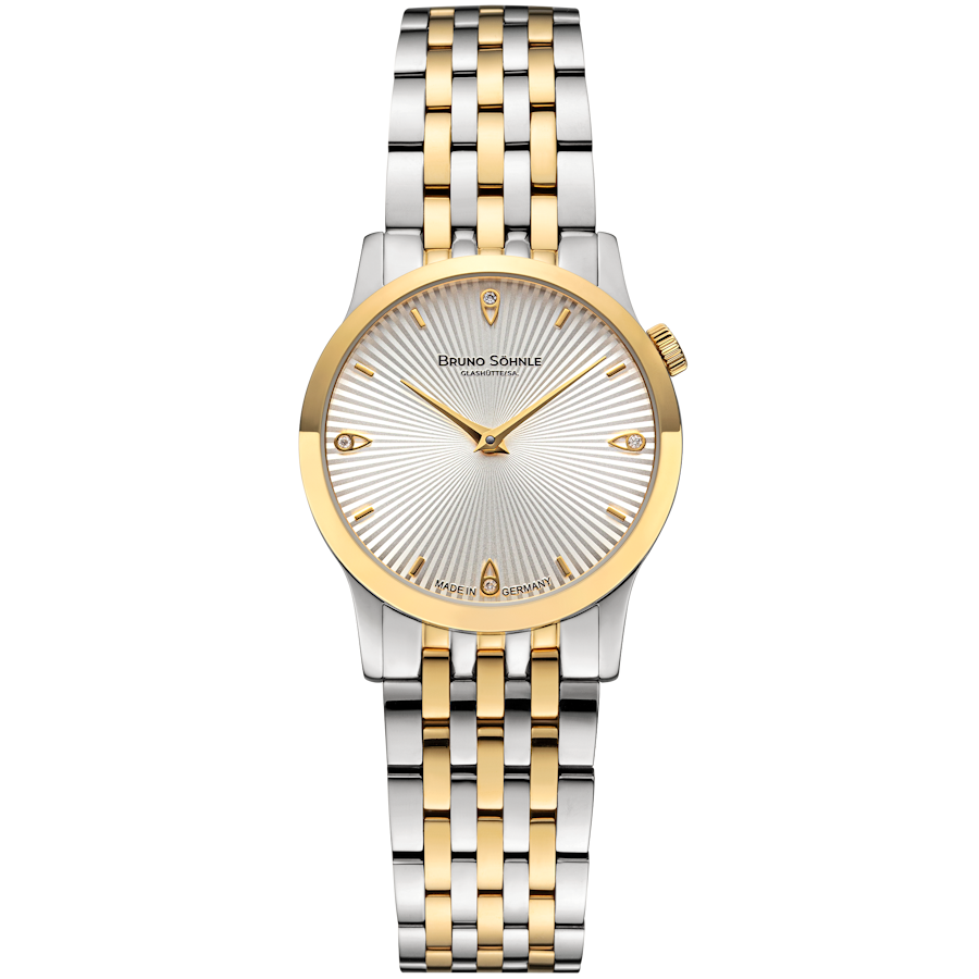 Die Bologna IV in der Bicolor-Version kombiniert Edelstahl mit partieller IP-Gold-Beschichtung, was ihr ein modernes und elegantes Aussehen verleiht. Mit einem Gehäusedurchmesser von 28,5 mm und einem silbernen Zifferblatt, das durch einen Wellenschliff und vier brillante Tropfen-Indizes verziert ist, bietet diese Uhr sowohl Stil als auch Funktionalität. Die Krone auf der 2-Uhr-Position bleibt ein hervorstechendes Designelement. Das Edelstahlband sorgt für Tragekomfort, während das Ronda 1062 Uhrwerk, veredelt in Glashütte, präzise Zeitmessung gewährleistet.