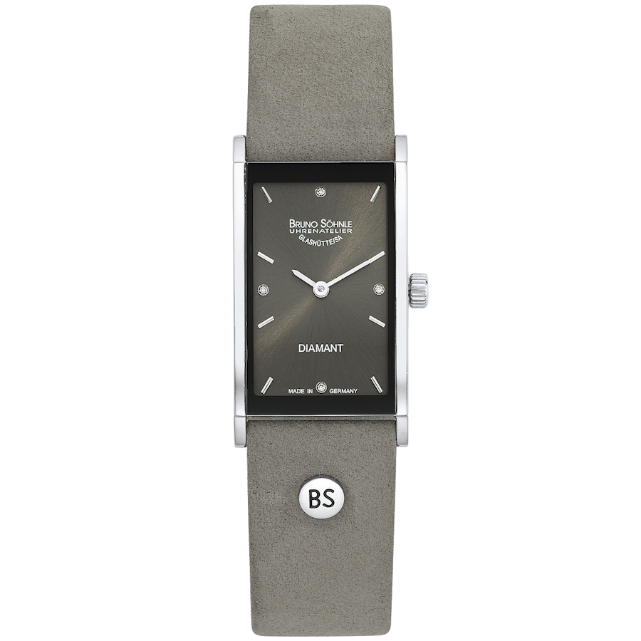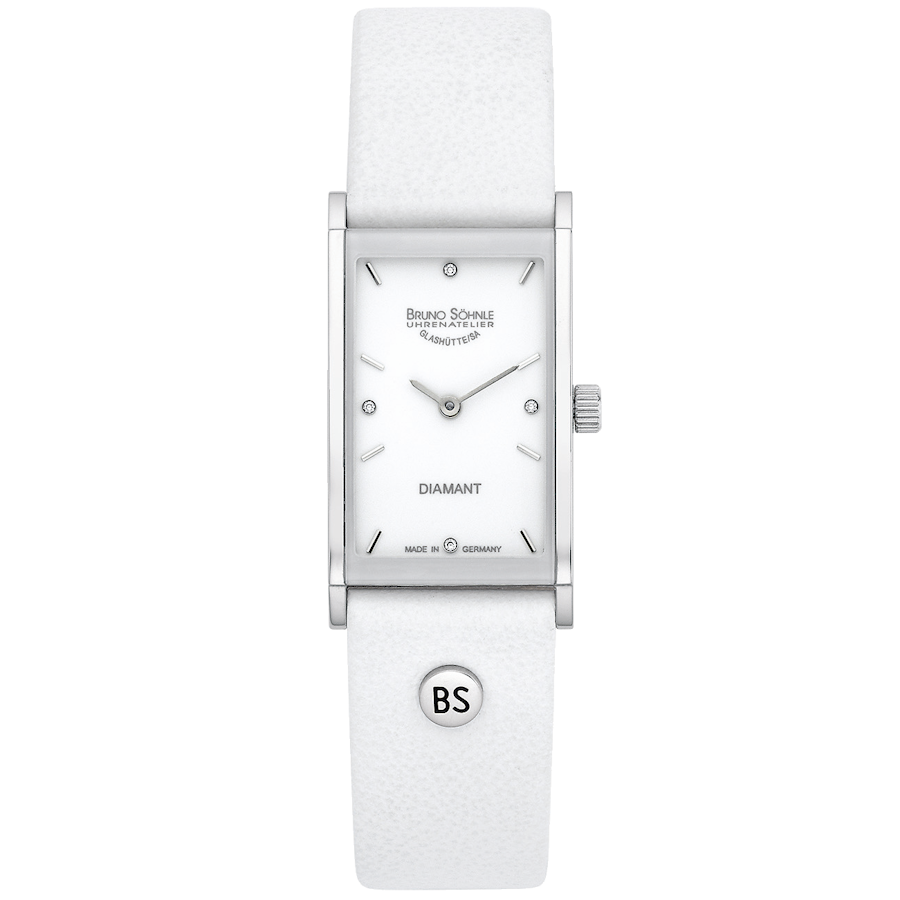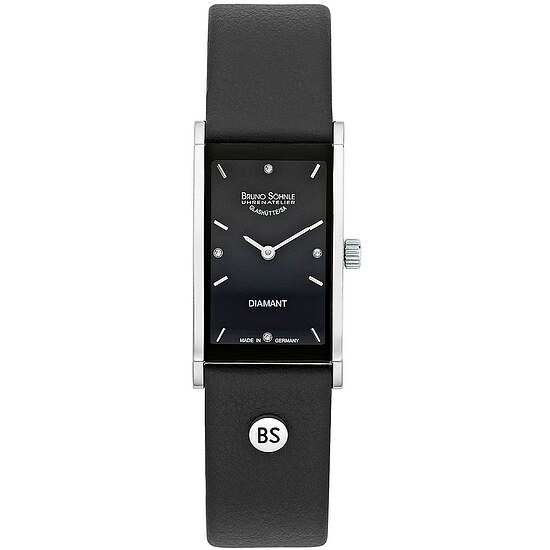 Quarzwerk in veredelter Bruno Söhnle-Ausführung (Basiswerk Ronda 1062), Edelstahlgehäuse, 20,0 x 29,0 mm, Höhe 6,1 mm, Saphirglas innen entspiegelt, 3 bar wasserdicht, Lederband mit Dornschließe, 4 Brillanten