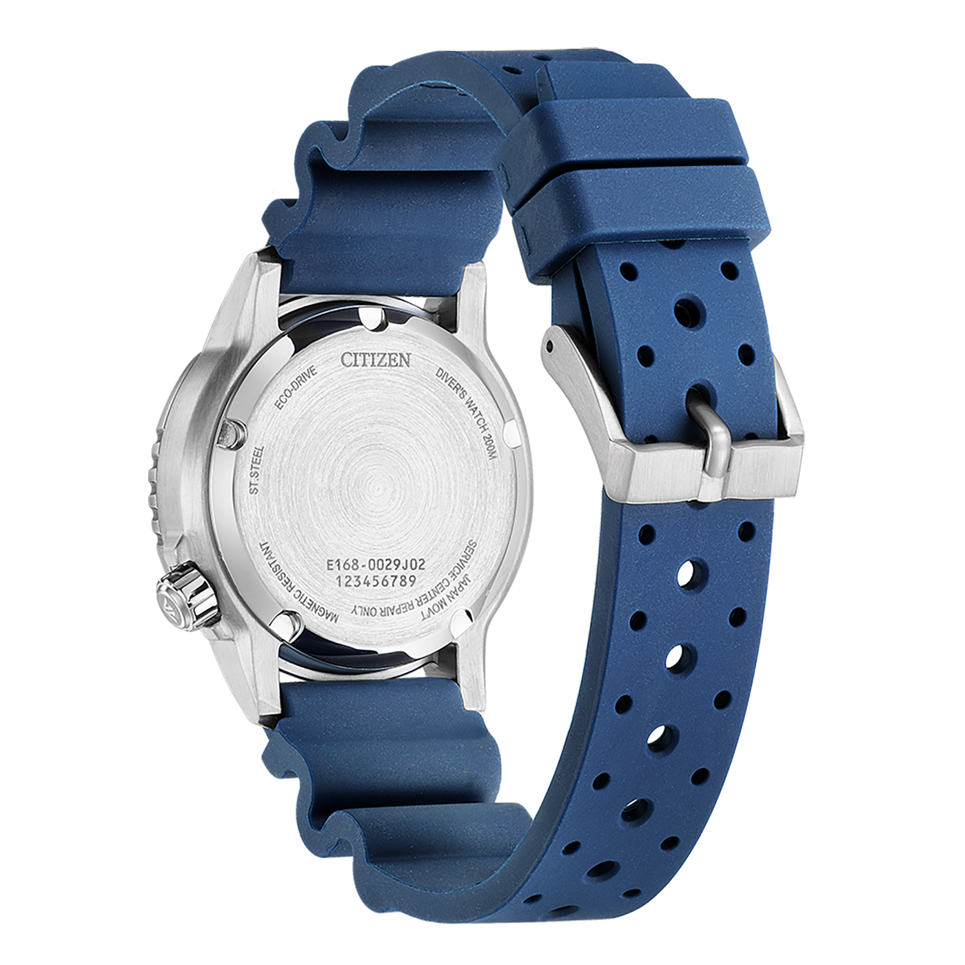 Beweisen Sie mit der ISO-zertifizierten Promaster Diver von CITIZEN®, dass eine Taucheruhr Spaß machen und funktional sein kann. Dank der Eco-Drive-Technologie wird sie durch Licht angetrieben und benötigt keine Batterie, sodass Sie nie wieder Ihren Gehäuseboden öffnen oder Ihren Tauchgang gefährden müssen. Mit Aluminiumring auf der Lünette, einseitig drehbarer Zeitanzeige und WR200. Ausgestattet mit unserer Eco-Drive Technologie – angetrieben durch Licht, jedes Licht. Benötigt nie eine Batterie. Kaliber Nummer E168.