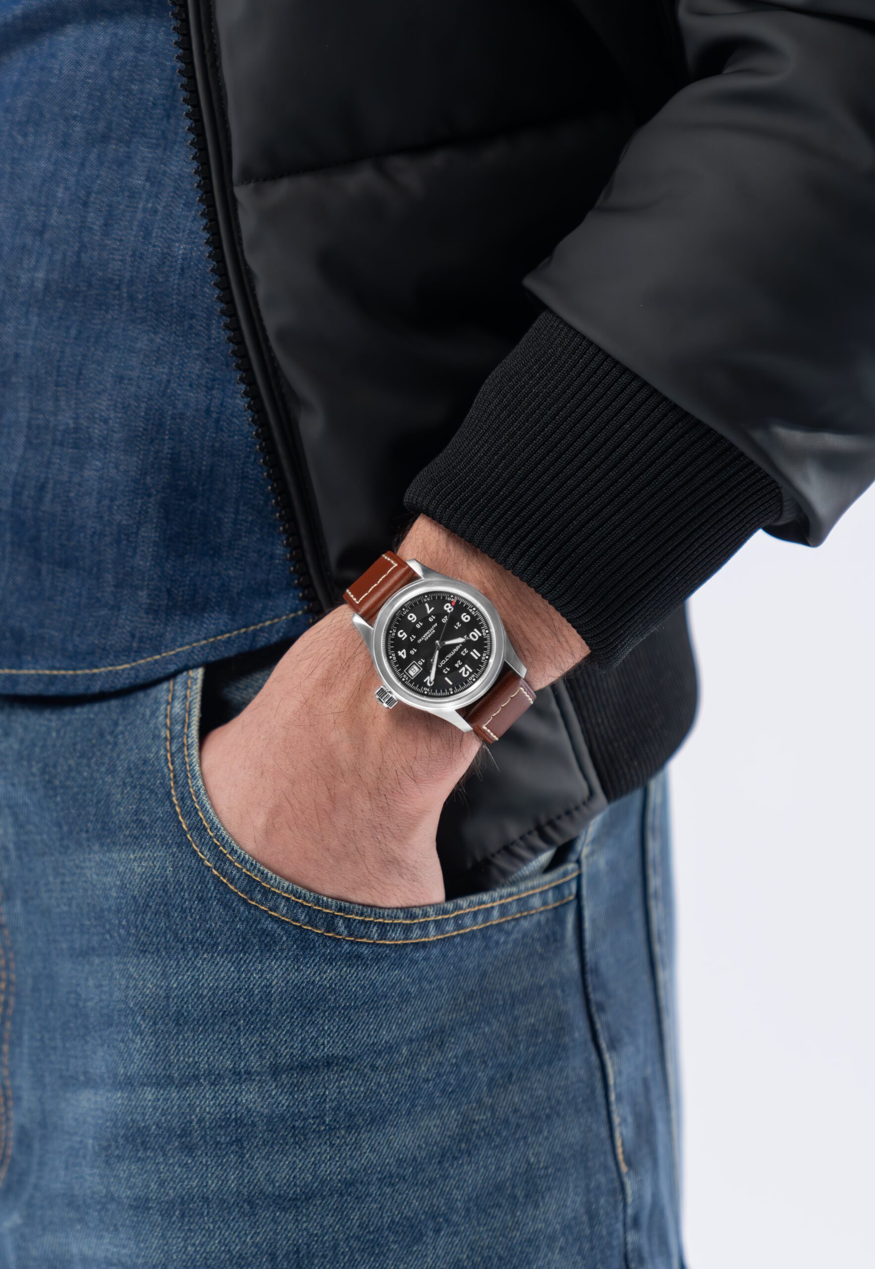 Wenn Sie eine Expedition planen, muss Ihre Grundausrüstung zuverlässig, widerstandsfähig, funktional und kompakt sein. Wenn es um militärisch inspirierte Eigenschaften geht, hält diese Uhr sogar mehr, als sie verspricht. Mit ihrem markanten Look und dem robusten Gehäuse und Armband, verstärkt von einem leistungsstarken Uhrwerk, wird sie Sie nicht im Stich lassen. Dank der Gangreserve von 80 Stunden, die das Automatikwerk H-10 bietet, begleitet Sie die Khaki Field Auto überall hin.