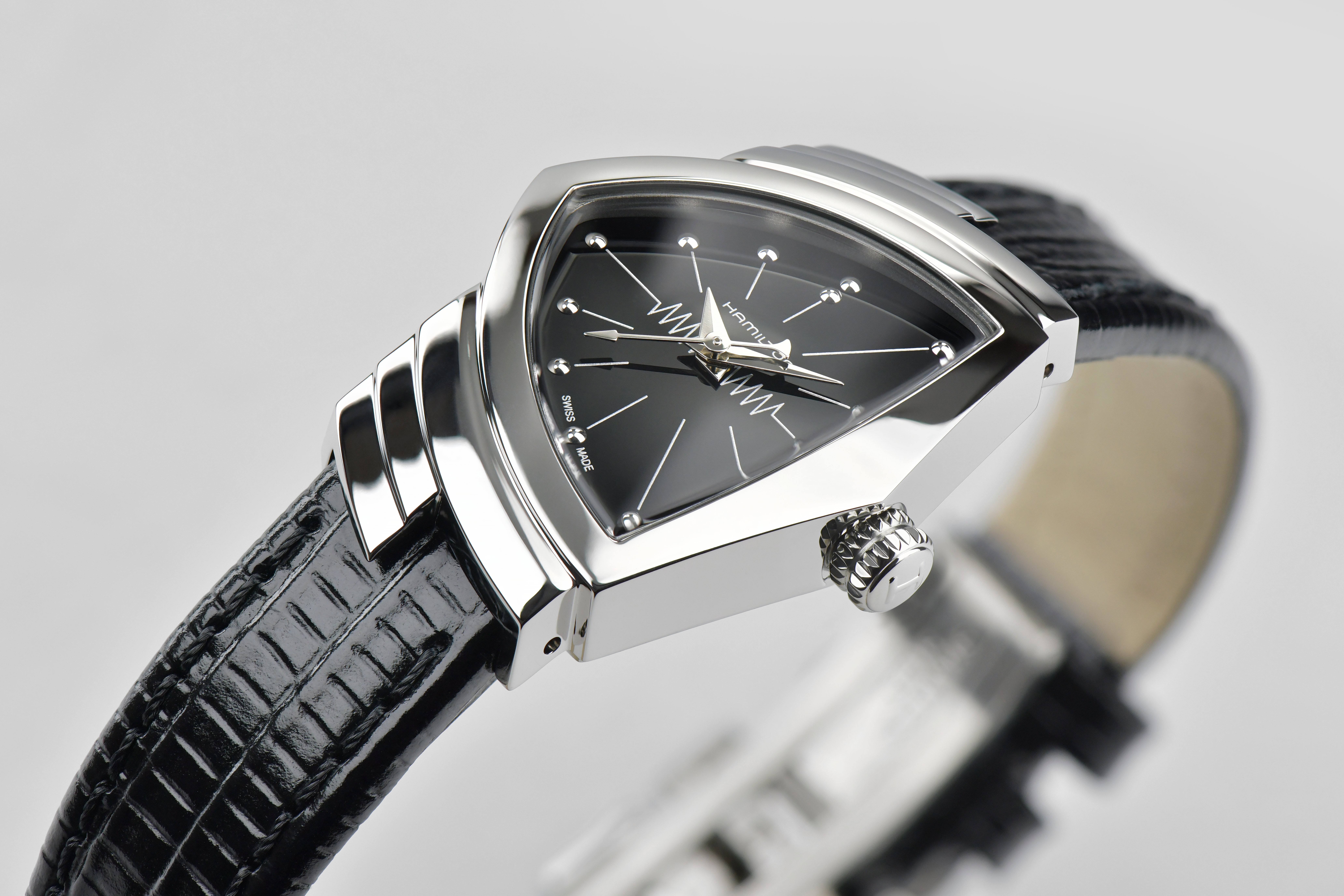 Die originale Ventura aus dem Jahr 1957 ging als erste batteriebetriebene elektrische Uhr in die Geschichte der Uhrmacherkunst ein. Mit ihrem gewagten und charakteristischen Design wurde sie schnell zu einer Ikone und einem Sammlerstück. Die neueste Auflage der Ventura ist eine treue Hommage an das Original und spiegelt die avantgardistische Schildform des modernen Designs aus der Mitte des Jahrhunderts wider.
