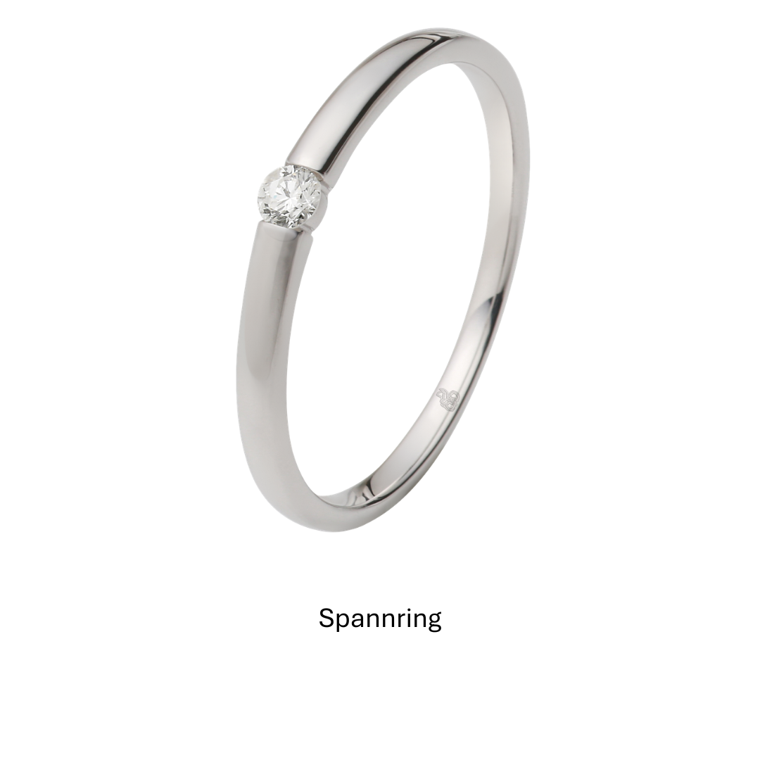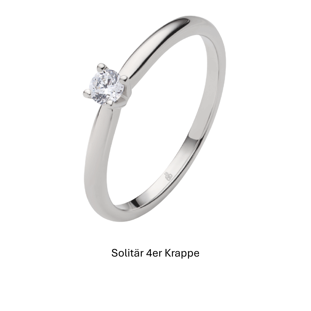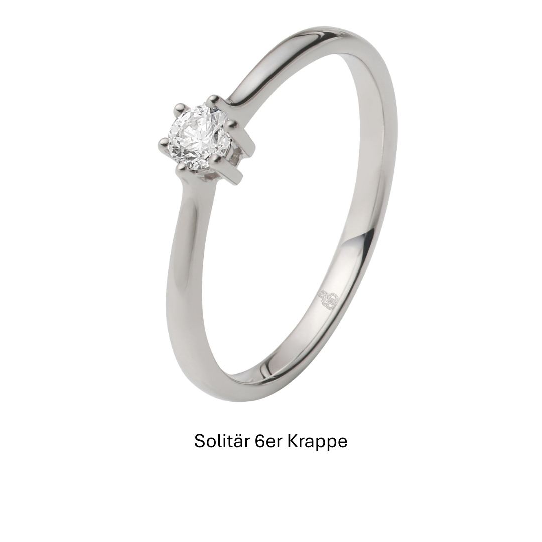 Legierung, Farbe des Edelmetalls, Fassungsart sowie Größe und Qualität des Diamanten sind bei jedem Ring individuell anpassbar.